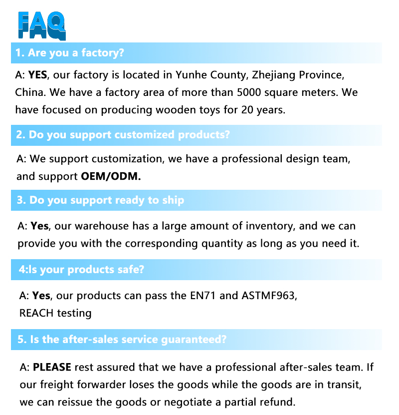 Yunhe Green Forest Crafts Co.,Ltd is a wooden toy company integrating industry and trade. The factory was founded in 2001, focusing on the production of children’s wooden toys with high professionalism. The factory covers an area of more than 50,000 square meters, and the factory adopts high-end equipment and fully automatic machine production. The company has more than 50 high-end technical talents and more than 200 factory employees. We can provide you with a full range of services, from product design, product proofing to mass production and delivery, and strictly control each process and delivery, on time and according to the quantity, to ensure your satisfaction! Our products completely use standard materials and comply with international safety standards, such as CE, EN71, CPC, CPSC, ASTM F963 and AS/NZS ISO8124. We have a professional after-sales system to ensure that you have no worries after-sales. Professional sales team, 24 hours online service. Looking forward to cooperation with you!!